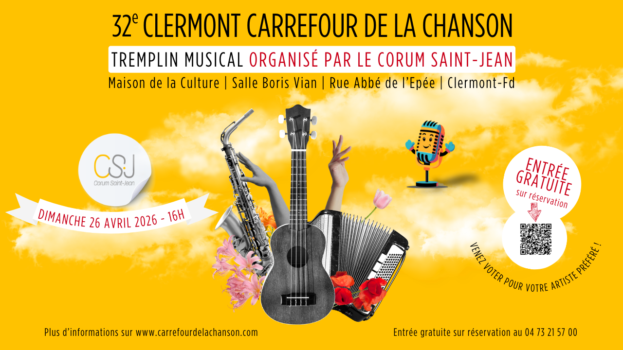 Le 32e tremplin musical Clermont Carrefour de la Chanson se tiendra le dimanche 26 avril 2026 à la Maison de la Culture, salle Boris Vian, à Clermont-Ferrand (63).